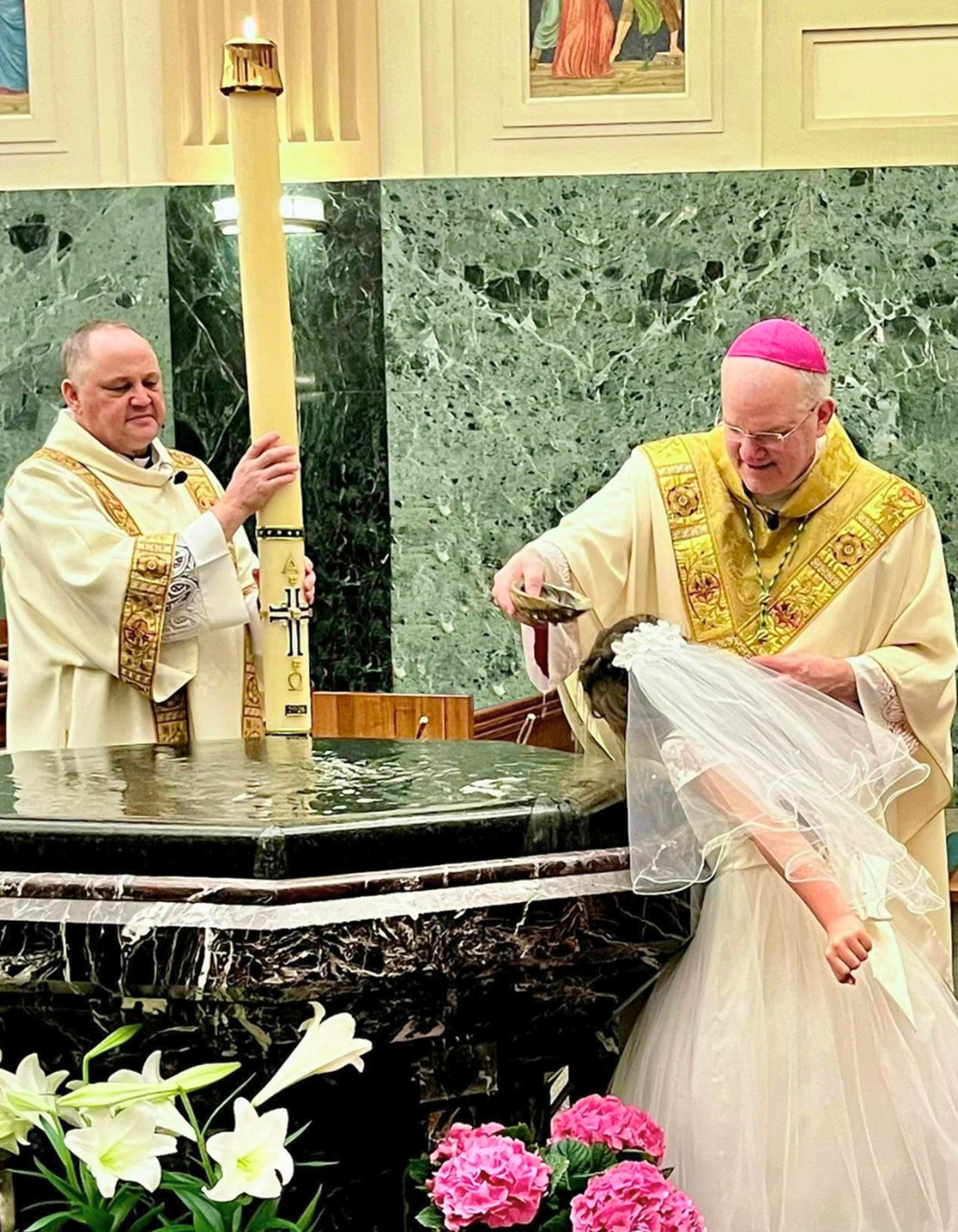 Photo of Bishop Dennis E. Spies presiding at baptisms at the Easter Vigil at the Cathedral of St. Raymond in Joliet, Illinois.