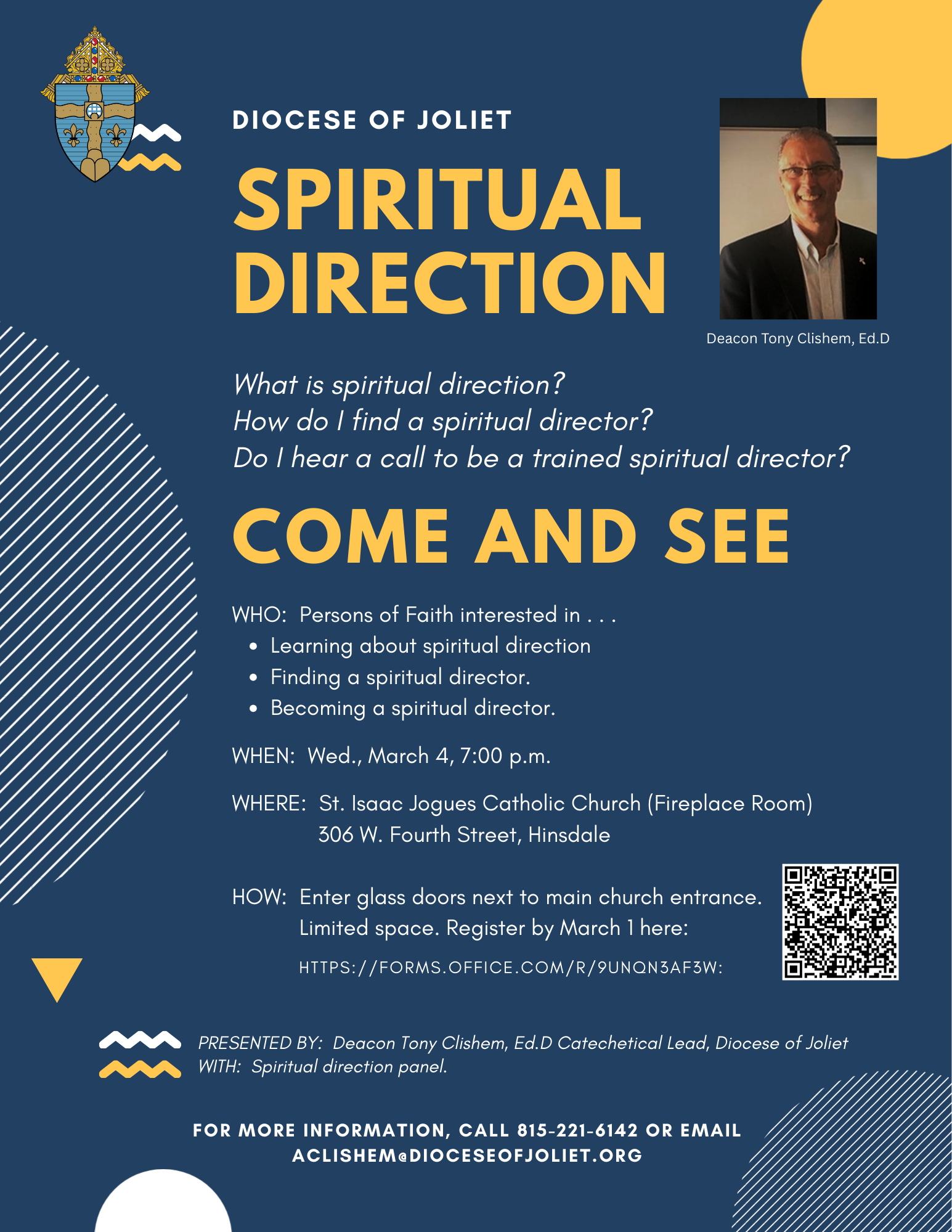 This event will occur at 7 p.m. on Wednesday, March 4 at St. Isaac Jogues Catholic Church (Fireplace Room), 306 W. Fourth Street, Hinsdale. Deacon Tony Clishem, the Office of Catechetical Formation Lead for the Diocese of Joliet, will offer a short presentation followed by a spiritual director panel discussion and Q & A.