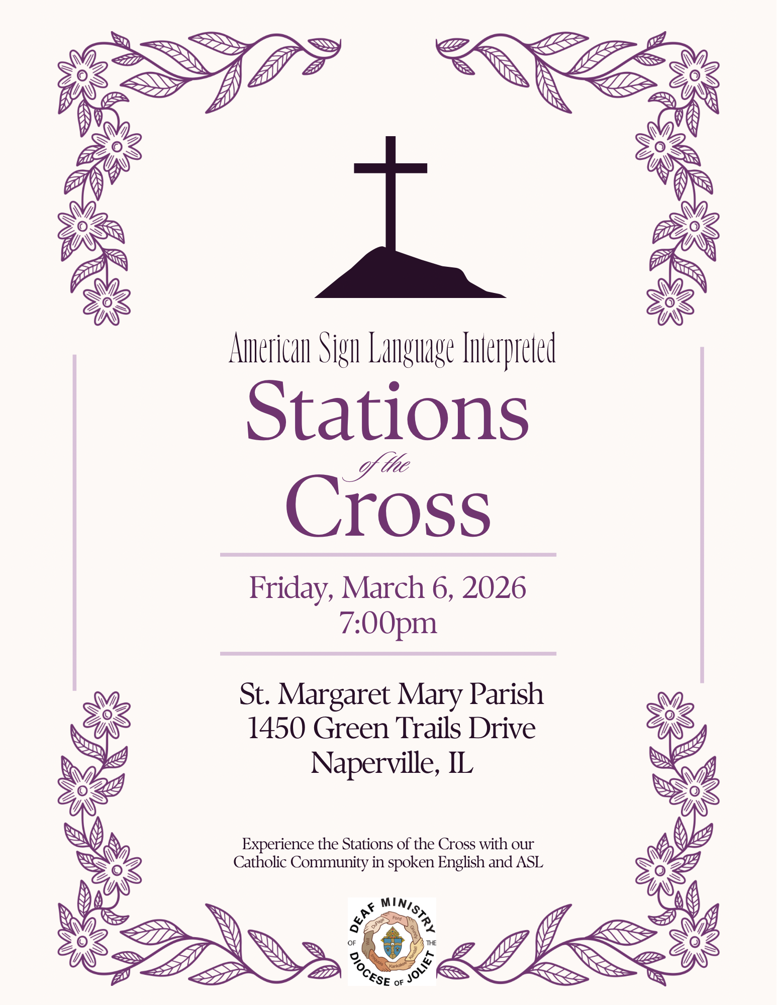 Join the Diocese of Joliet Deaf Ministry for Stations of the Cross on Friday March 6, 2026, at St. Margaret Mary Parish in Naperville. Stations begin at 7 pm in American Sign Language and spoken English.