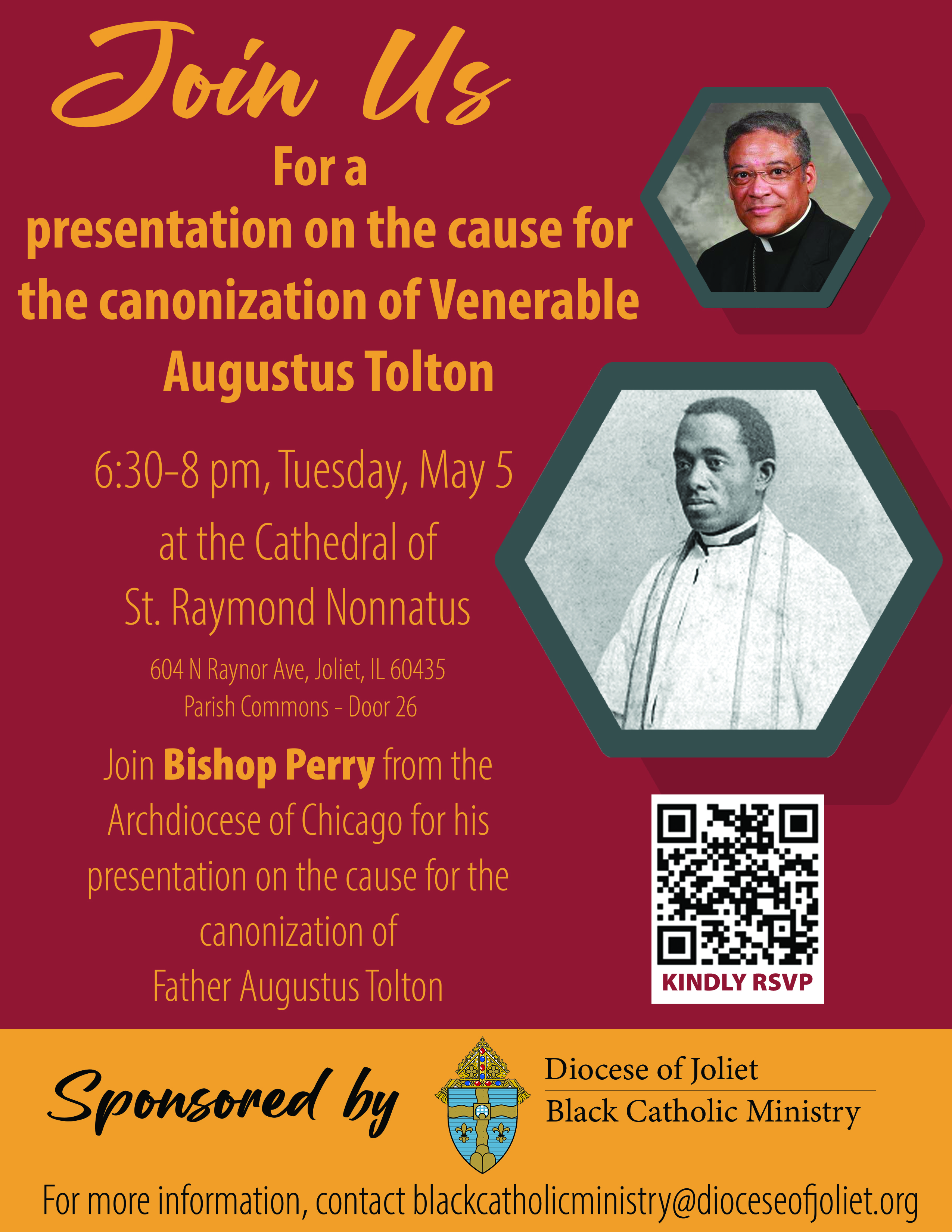 Join us for a presentation on the cause for the canonization of Venerable Augustus Tolton with Bishop Perry from the Archdiocese of Chicago on Tuesday, May 5 from 6:30-8pm at the Cathedral of St. Raymond Nonnatus.