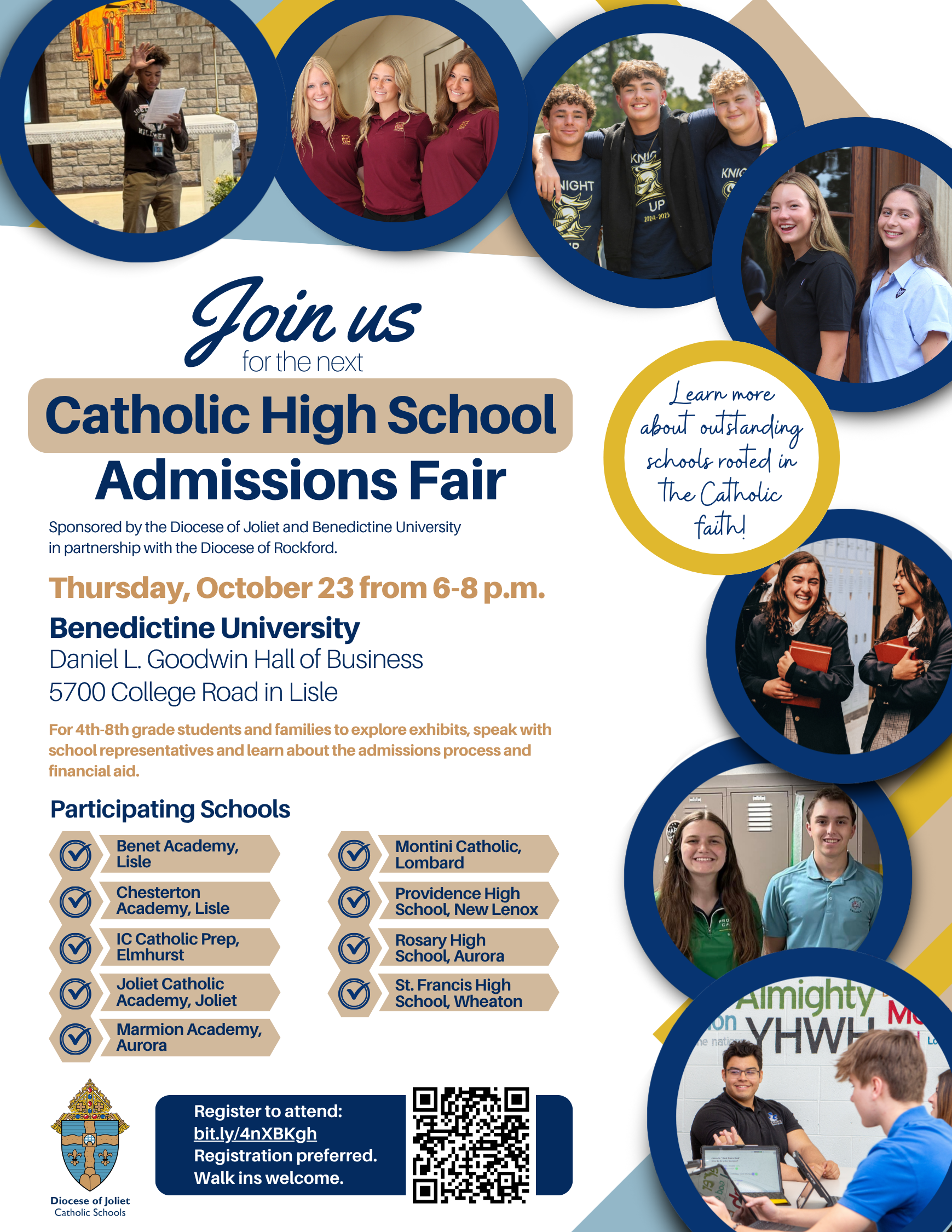 Sponsored by the Diocese of Joliet and Benedictine University in partnership with the Diocese of Rockford, students and families will be able to explore exhibits, speak with school representatives, and learn about the admissions process and financial aid.
