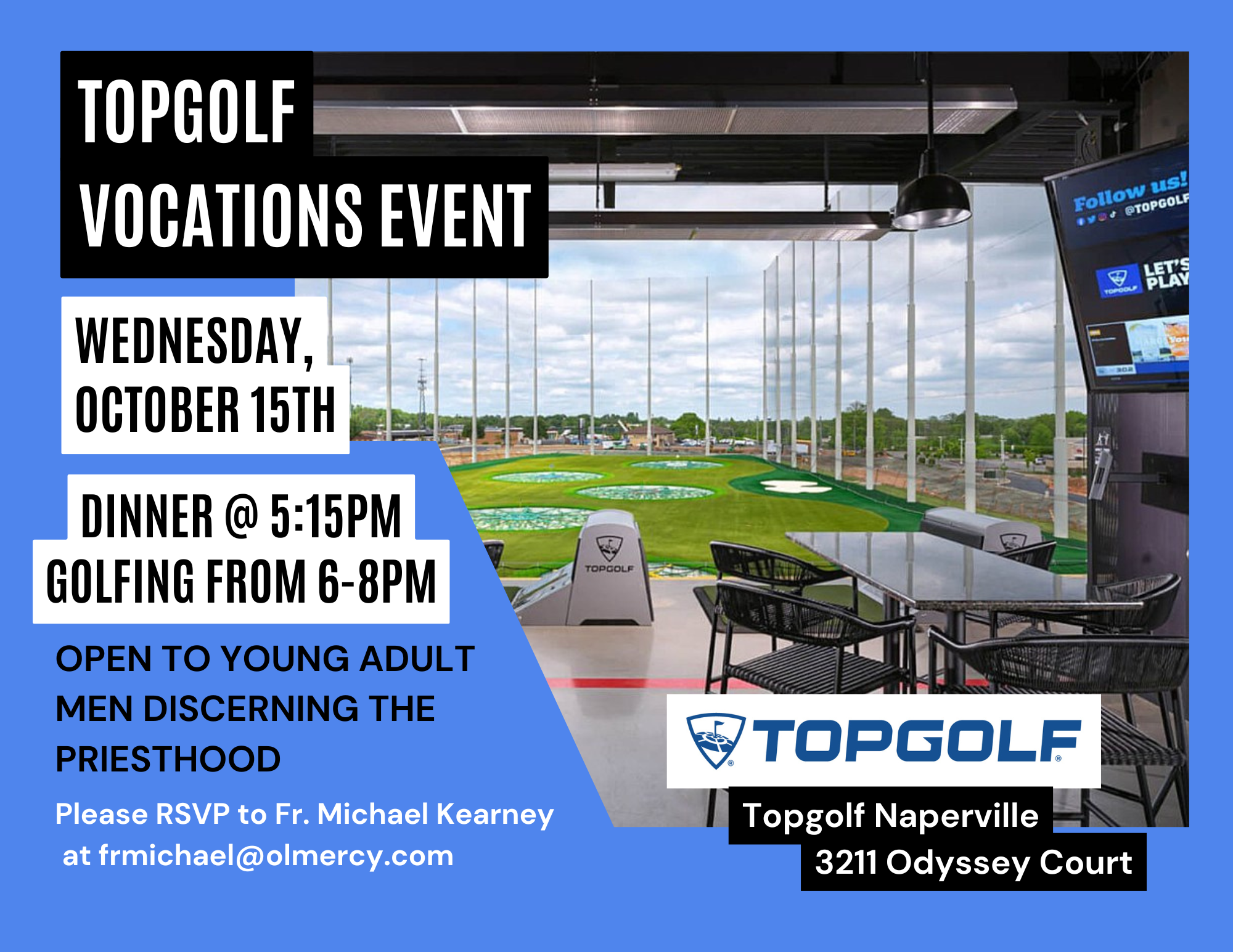 We’re inviting young men (age 18+) open to the priesthood for an evening with Fr. Michael Kearney at Top Golf Naperville 3211 Odyssey Ct., Naperville, IL. To RSVP, please email Fr. Michael at [email protected].